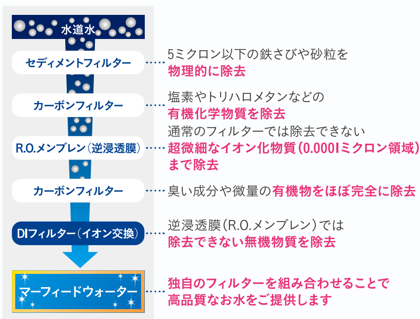 マーフィードウォーター「ザ・プレミアム」は、R.O.(逆浸透膜)では除去しきれなかった無機物質(※1)を、マーフィード独自の純水化フィルターにより99.99%除去し、水道水の中の不純物、有害物質をゼロに(※2)。